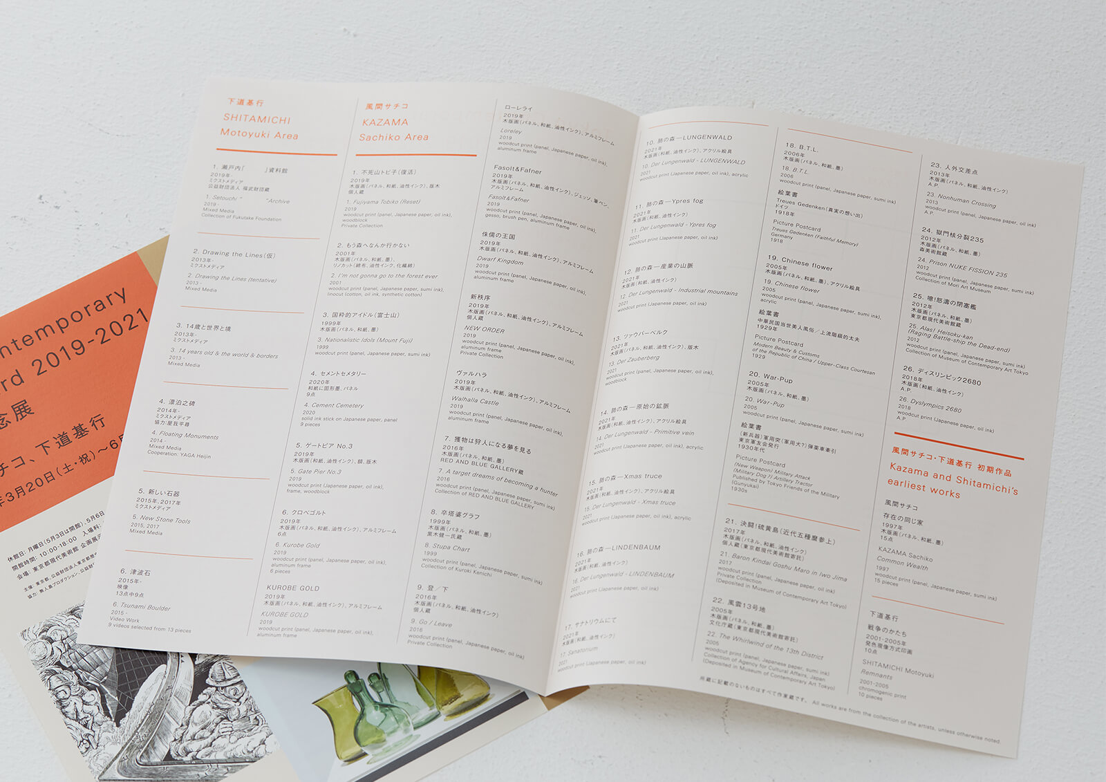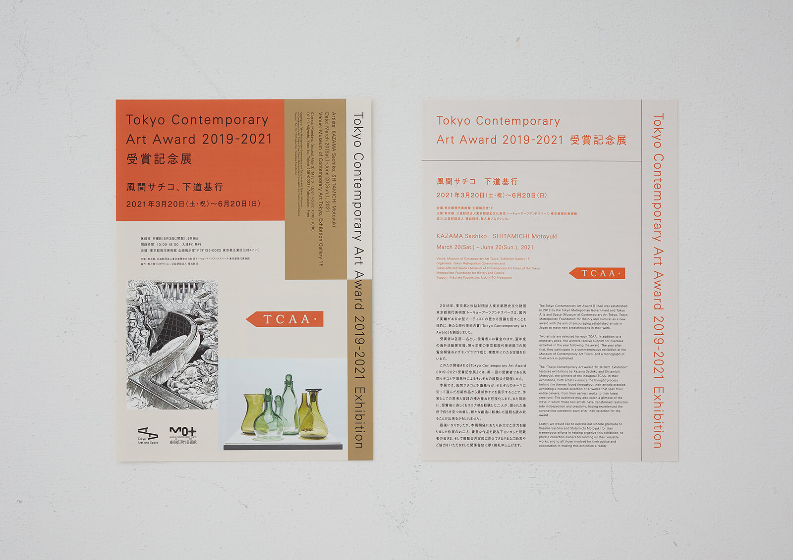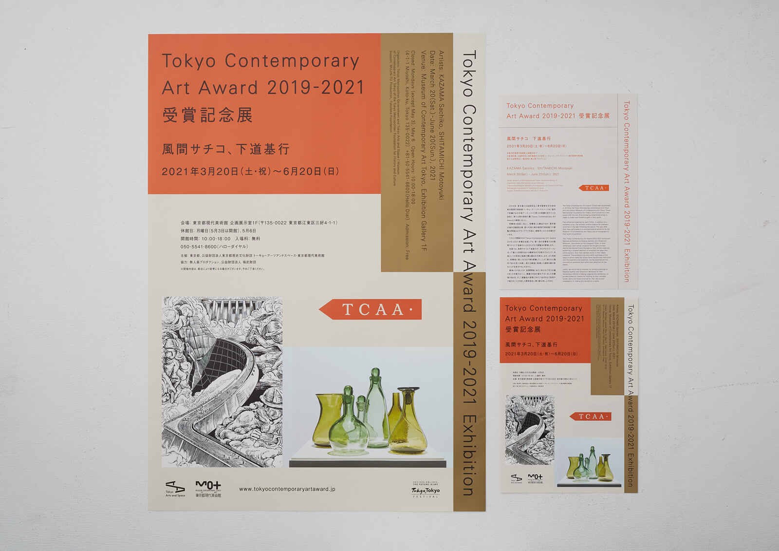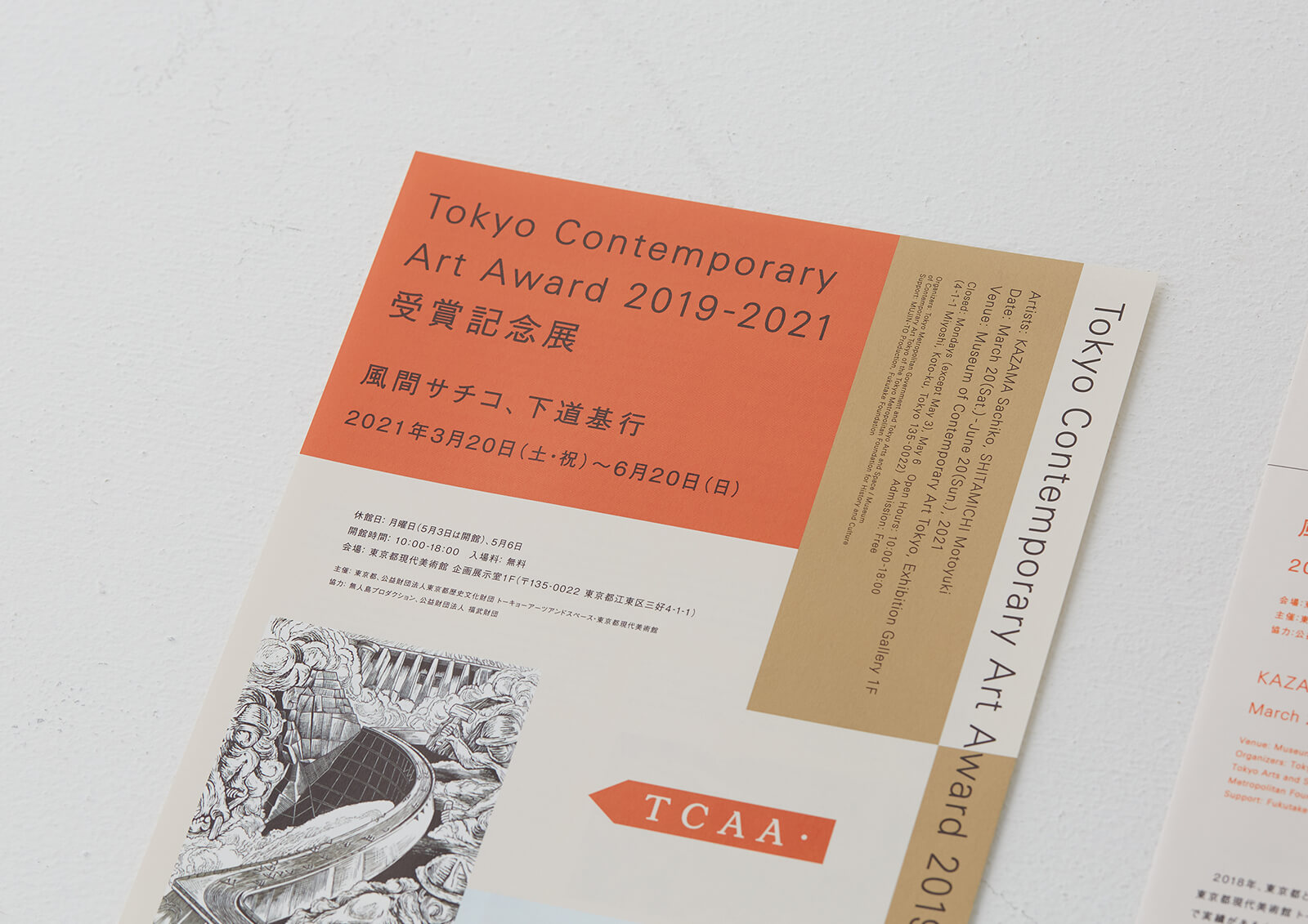 東京都現代美術館で開催された、 第一回Tokyo Contemporary Art Award受賞者2名による展覧会の広報物、 会場グラフィックを担当しました。 その年のロゴマークで使用されたオレンジ色に加え、 差し色として金色を用いることで、 落ち着いた印象を持たせつつも受賞を祝う華やかさを演出しました。