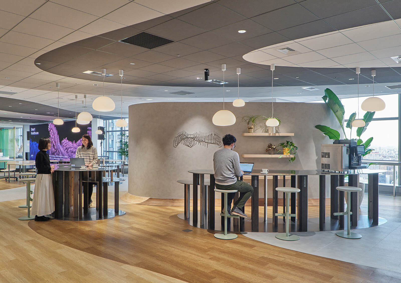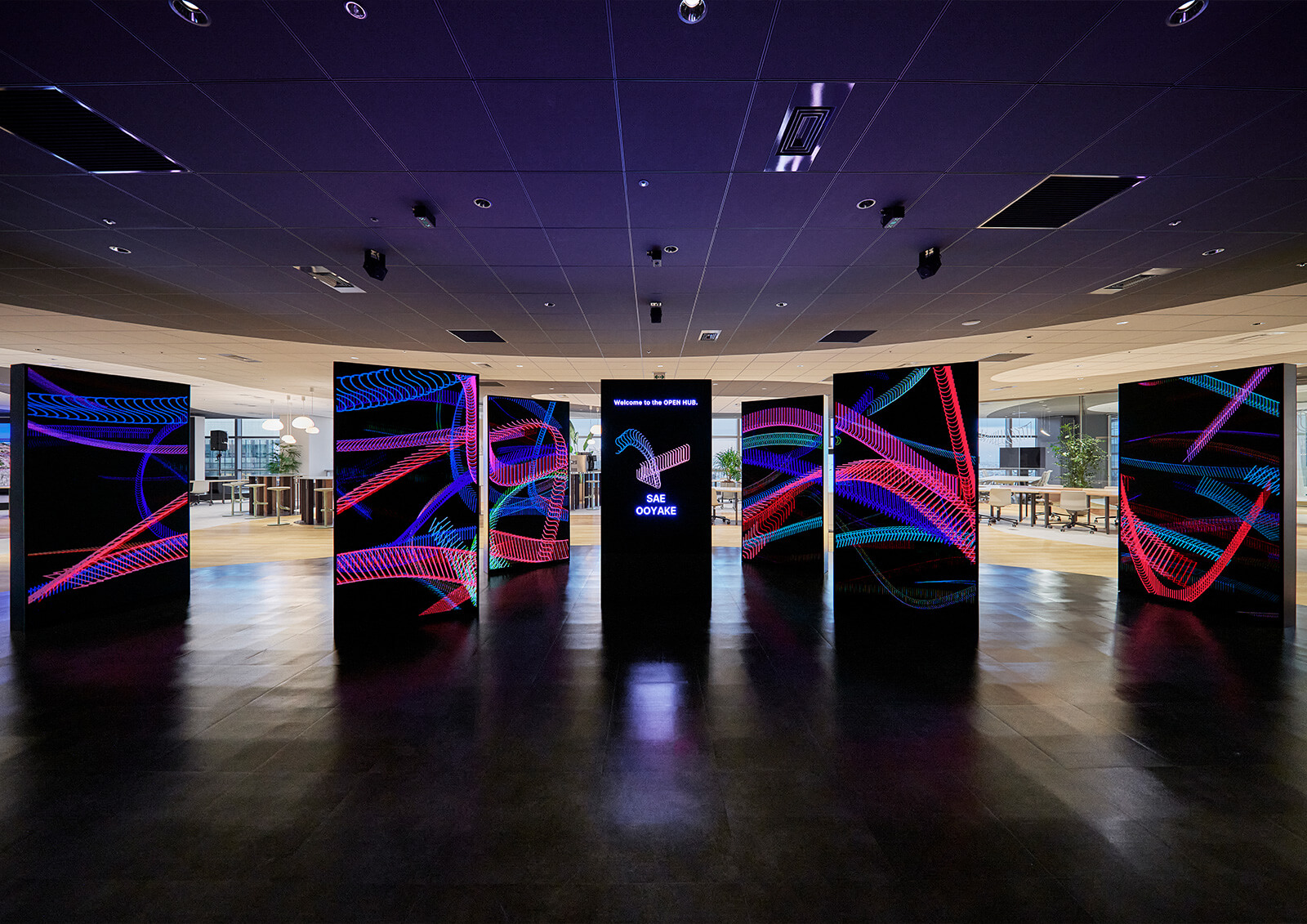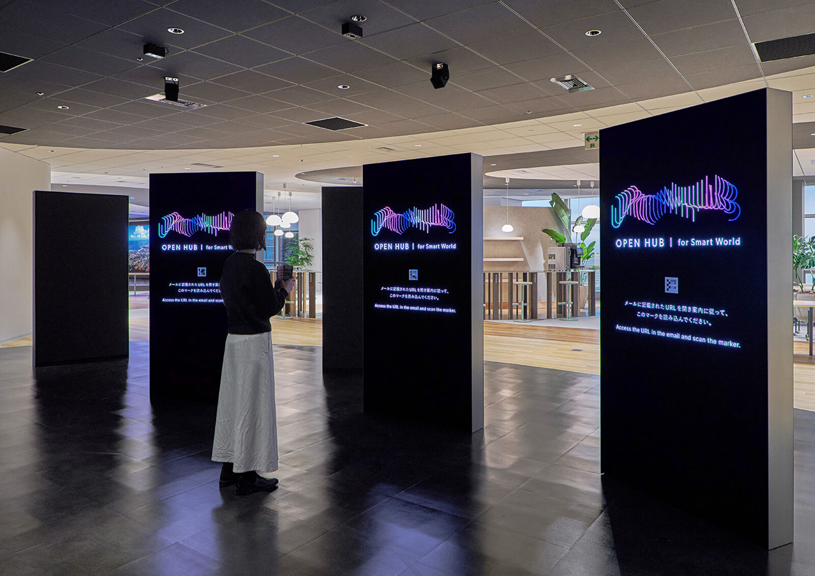 大手町プレイス ウエストタワーにオープンしたワークプレイス 「OPEN HUB for Smart World」のロゴデザイン、サイン計画などを担当しました。